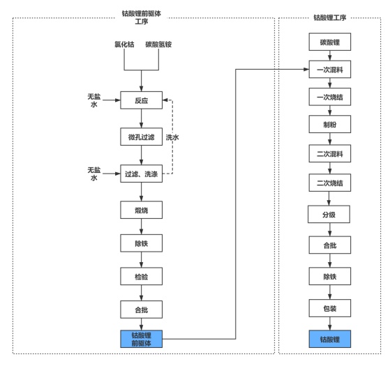 目前我國鈷酸鋰生產主要采用的是高溫固相法和液相合成法兩種。其中,高溫固相反應法將鋰源、前驅體鈷源、添加劑按照一定的化學計量比進行混合,混料均勻后在一定的溫度和含氧氣氛下進行燒結,然后進行粉碎處理及再次燒結之后制得鈷酸鋰。