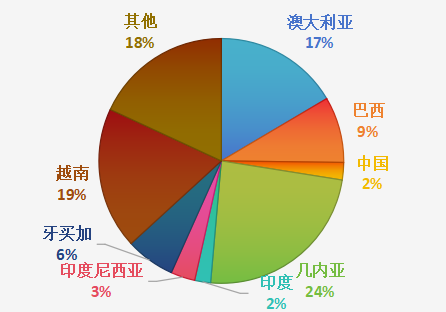 根據美國地質調查局《礦產品摘要2023》,截至2022年底,全球已探明鋁土礦儲量約為310億噸,預測資源量為550至750億噸。其中,非洲占32%、大洋洲占23%、南美和加勒比占21%,亞洲占18%,其他地區約占6%。從國家分布看,已探明鋁土礦資源主要分布于幾內亞、澳大利亞、巴西、牙買加、越南、印度尼西亞等國家和地區,中國已探明鋁土礦資源儲量僅占全球的2.3%。