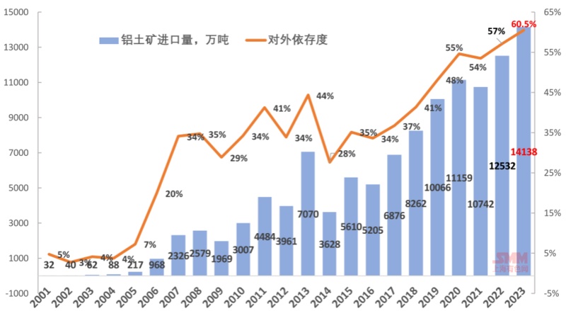 中國是全球鋁土礦貿易量最大的國家,進口量全球占比約為四分之三,尤其是自2019年以來,進口鋁土礦已連續五年超過1億噸,2023年中國累計進口鋁土礦14138萬噸,同比增長12.7%,再創歷史新高。