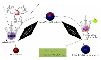 Chen C等人用TEOS和氨水溶膠凝膠反應(yīng)合成SiO2微粒,通過(guò)乙烯基三乙氧基硅烷改性SiO2微粒,制備出具有乙烯基的SiO2微球模板。然后加入苯乙烯(St)和二乙烯基苯(DVB)利用分散聚合法合成PS/DVB/SiO2的核殼結(jié)構(gòu)微球。通過(guò)氫氧化鈉蝕刻SiO2核,獲得P(S-DVB)中空微球。