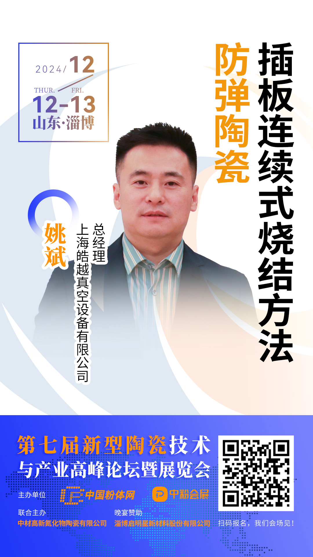 2024年12月12日-13日,中國粉體網(wǎng)將在山東淄博舉辦“2024第七屆新型陶瓷技術(shù)與產(chǎn)業(yè)高峰論壇”,來自上海皓越真空設(shè)備有限公司總經(jīng)理姚斌將帶來《防彈陶瓷插板連續(xù)式燒結(jié)方法》的報(bào)告。