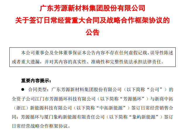 中國粉體網(wǎng)訊 11月20日,廣東芳源新材料集團(tuán)股份有限公司發(fā)布關(guān)于簽訂日常經(jīng)營重大合同及戰(zhàn)略合作框架協(xié)議的公告。