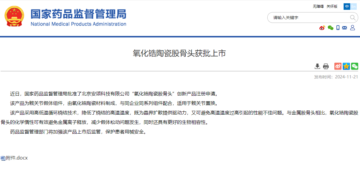 中國粉體網訊 2024年11月21日,據NMPA官網顯示,安頌科技旗下創新產品“氧化鋯陶瓷股骨頭”的注冊申請獲得了批準,注冊證編號:國械注準20243132300。