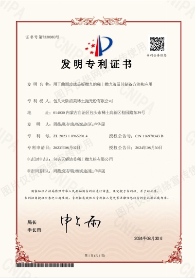 中國(guó)粉體網(wǎng)訊 近日,天驕清美“用于曲面玻璃蓋板拋光的稀土拋光液及其制備方法和應(yīng)用”獲得國(guó)家發(fā)明專(zhuān)利授權(quán),在高端稀土拋光材料領(lǐng)域再次實(shí)現(xiàn)新突破。
