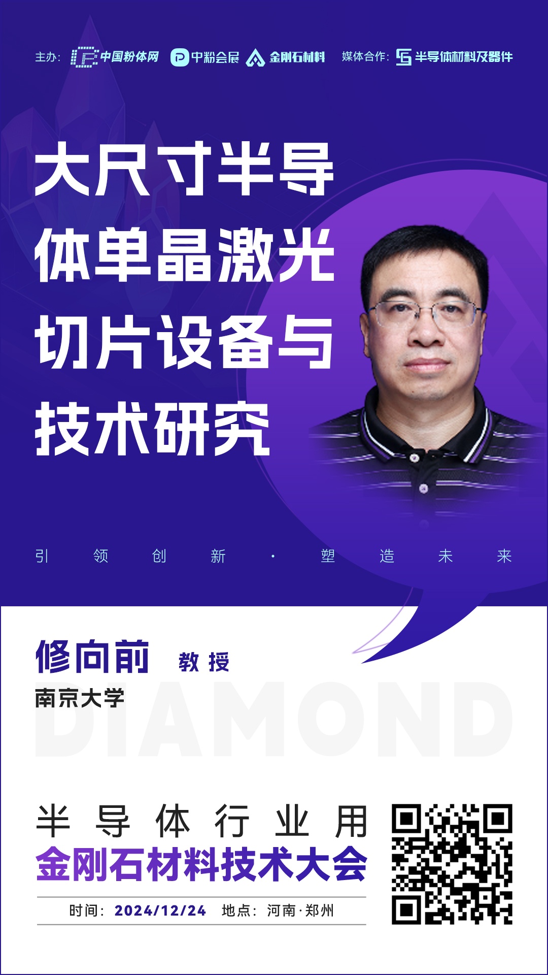 2024年12月24日,中國粉體網將在河南·鄭州舉辦“2024半導體行業用金剛石材料技術大會”。屆時,我們邀請到南京大學修向前教授出席本次大會并作題為《大尺寸半導體單晶激光切片設備與技術研究》的報告,修教授將為您具體介紹大尺寸半導體單晶激光切片設備的研究進展及規模化應用展望。