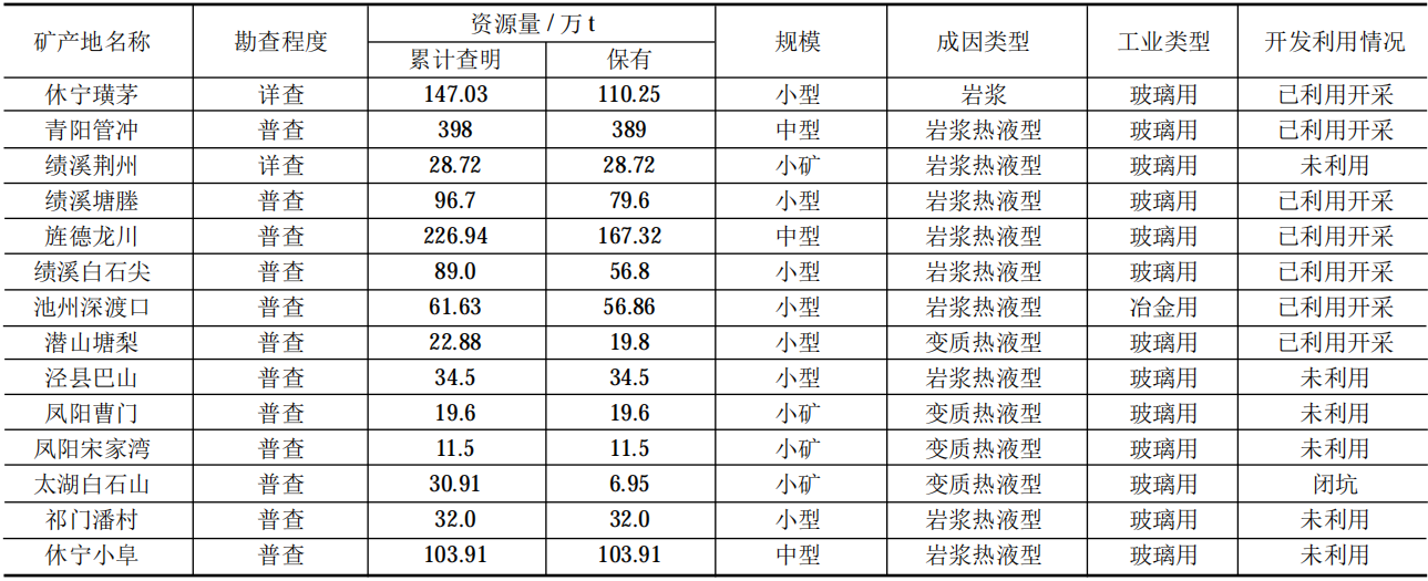 安徽省內脈石英礦床類型主要為巖漿熱液型和變質熱液型。斷裂構造與脈石英礦的形成關系密切,為礦體形成提供了良好的運移通道和成礦空間,富含硅的巖漿熱液、變質熱液沿構造裂隙運移并充填其中,形成脈石英礦。