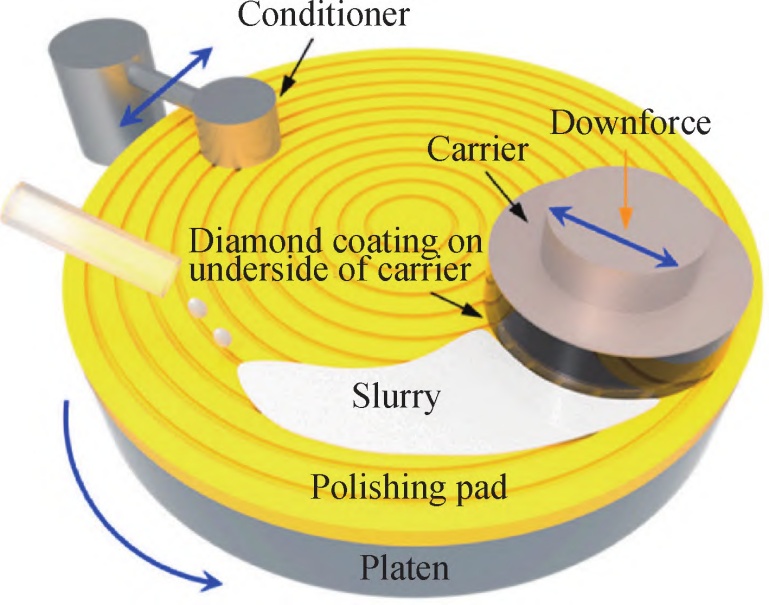 化學機械拋光(CMP)是一種超精密拋光的加工方法,通過在機械拋光過程中加入氧化劑,氧化碳原子提高拋光速率,是一種利用機械與化學氧化協同作用來實現工件表面平坦化的技術。相比于機械拋光,化學機械拋光對金剛石的損傷更小,常用于CVD單晶和多晶金剛石膜的研究。