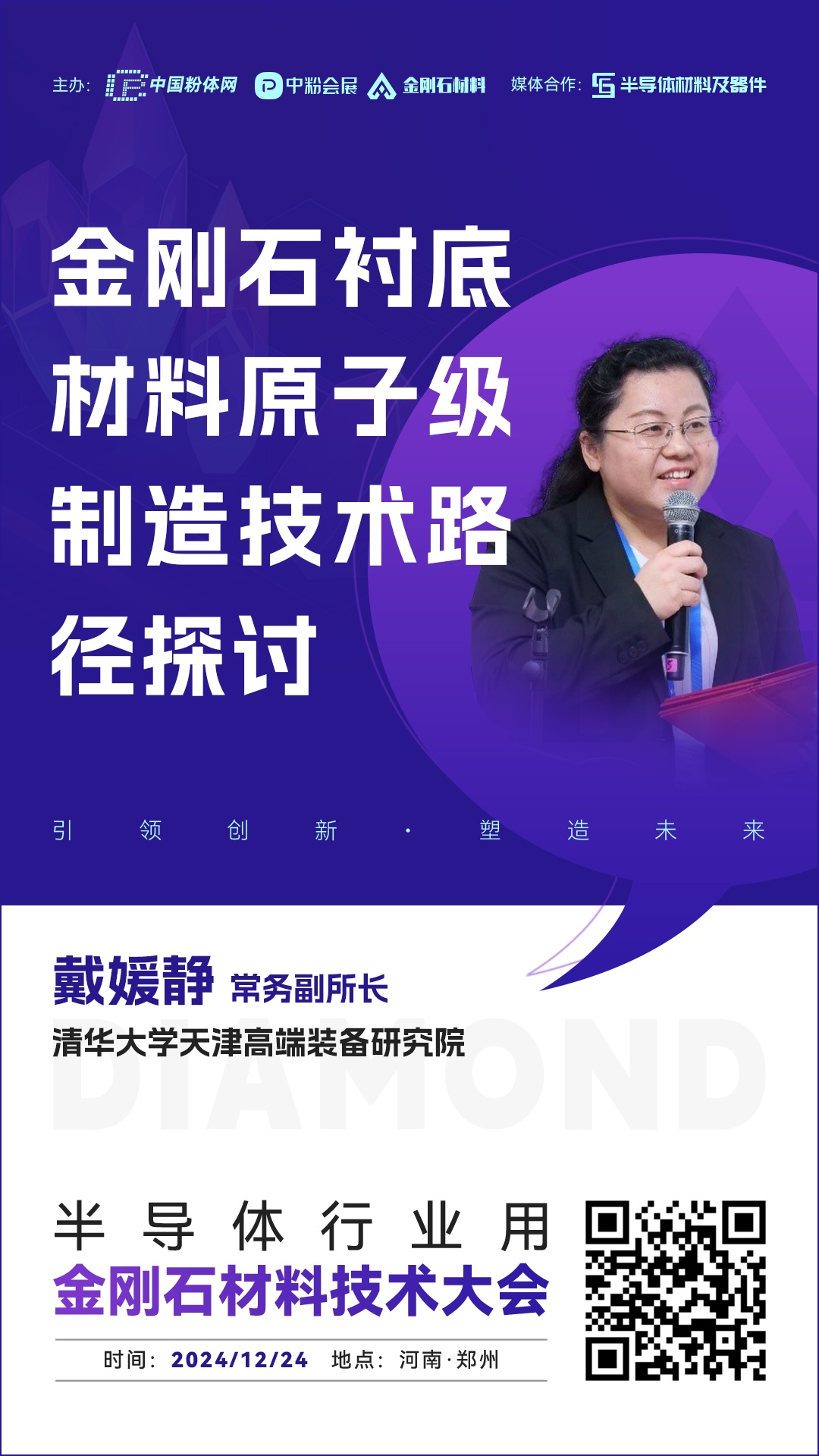 2024年12月24日,中國粉體網將在河南·鄭州舉辦“2024半導體行業用金剛石材料技術大會”。屆時,我們邀請到清華大學天津高端裝備研究院常務副所長戴媛靜教授出席本次大會并作題為《金剛石襯底材料原子級制造技術路徑探討》的報告,戴媛靜教授將結合國內外金剛石超精加工的研究進展,從原子尺度出發,采用仿真計算、實驗研究等手段對金剛石襯底化學機械拋光的原子級去除機理進行探討,為金剛石襯底材料的高效制造提供可能的技術途徑。