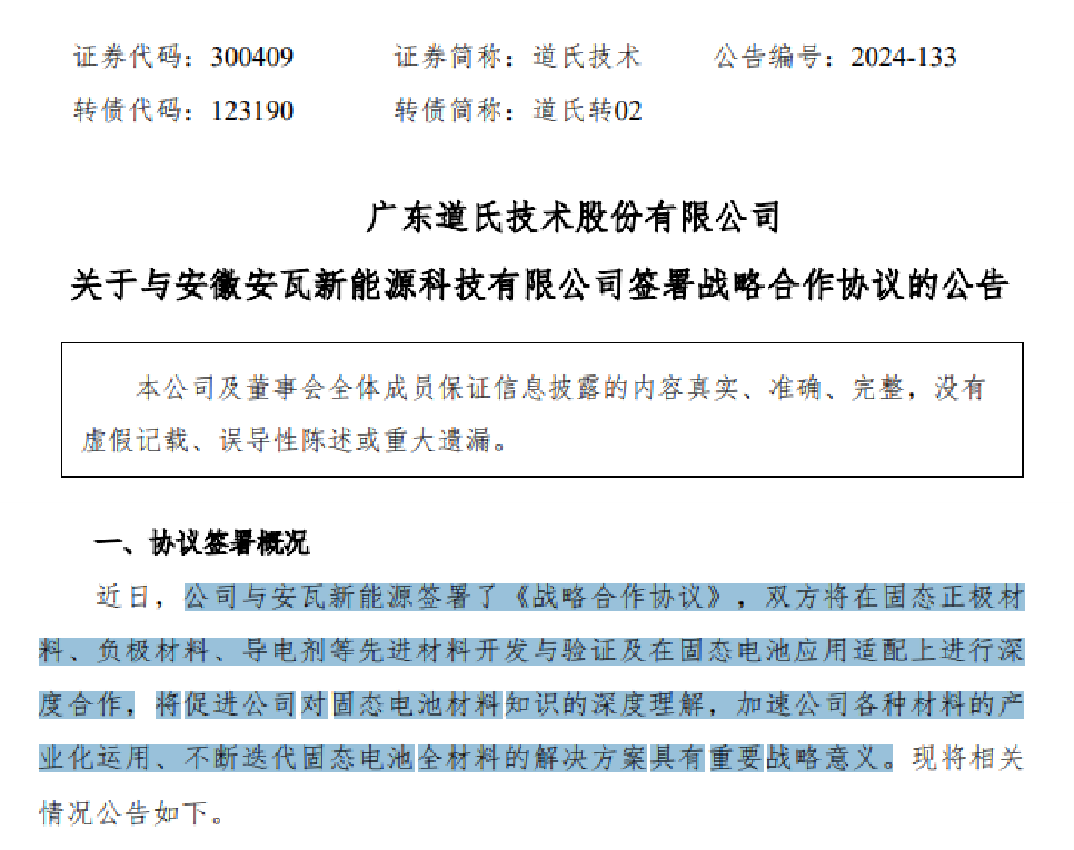 中國粉體網訊 12月4日,廣東道氏技術股份有限公司(簡稱:道氏技術)發布公告稱,公司與安徽安瓦新能源科技有限公司(簡稱:安瓦新能源)簽署《戰略合作協議》,雙方將在固態正極材料、負極材料、導電劑等先進材料開發與驗證及在固態電池應用適配上進行深度合作。