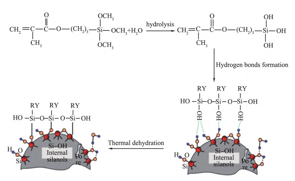 硅烷偶聯劑改性:硅烷偶聯劑種類繁多,選擇靈活,應用更加廣泛,可根據不同的基體介質選擇含對應官能團的偶聯劑作表面改性劑。二氧化硅的硅烷化改性是通過硅烷偶聯劑的水解、縮合反應實現的。另外,在有水存在的情況下,硅烷偶聯劑會發生水解反應,產生硅醇,硅醇易與二氧化硅表面羥基發生脫水縮合反應,同時硅醇也會脫水自聚。