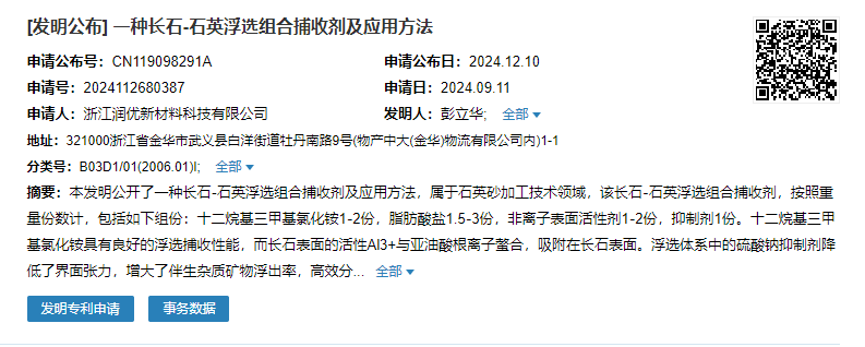 而潤優新材的“一種長石-石英浮選組合捕收劑及應用方法”采用無氟無酸浮選法分離長石和石英,藥劑組成簡單,原料易得,礦粒附著率和浮選效率高,安全性優,在保證高效分離長石和石英的前提下,得到較高純度的石英產品,殘余雜質元素少,對提高每段浮選作業的分離和除雜效率具有重要的指導意義和推廣價值。