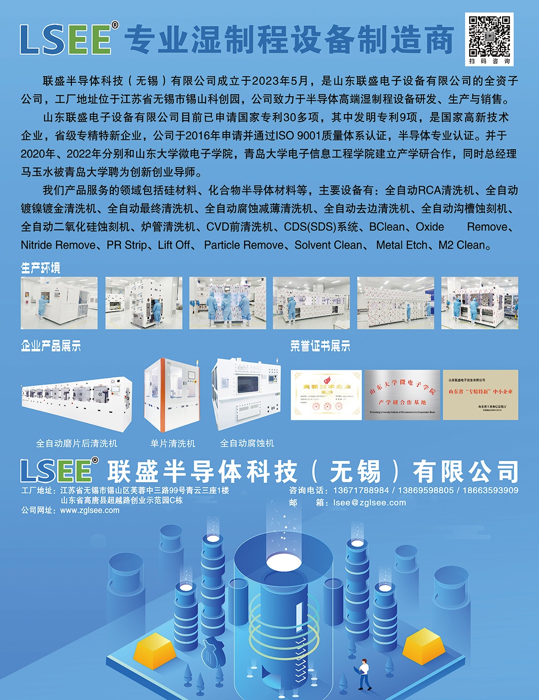 我們產(chǎn)品服務(wù)的領(lǐng)域包括硅材料、化合物半導(dǎo)體材料等,主要設(shè)備有:全自動RCA清洗機、全自動鍍鎳鍍金清洗機、全自動最終清洗機、全自動腐蝕減薄清洗機、全自動去邊清洗機、全自動溝槽蝕刻機、全自動二氧化硅蝕刻、爐管清洗機、CVD前清洗機、CDS(SDS)系統(tǒng)、BClean、0xideRemove、Nitride Remove、PR Strip,lift off、ParticleRemove, Solvent Clean、 MetalEtch, M2 Clean。