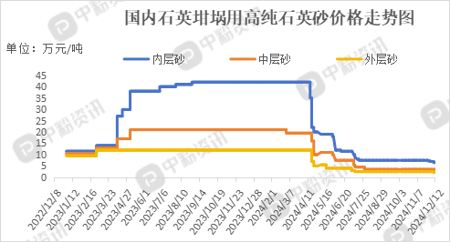 截至12月12日,國內高純石英砂(石英坩堝外層用)均價在2.2萬元/噸左右,環比下調12.00%,國內高純石英砂(石英坩堝中層用)市場均價在3.5萬元/噸,國內高純石英砂(石英坩堝內層用)市場成交價在6.5萬元/噸左右,環比下調7.14%。
