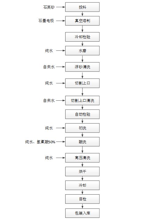 其主要生產(chǎn)工藝流程為:投料-真空熔制-冷卻檢驗-水磨-浮砂清洗-切割上口-切割上口清洗-自動檢驗-初洗-酸洗-高壓清洗-烘干冷卻-目檢-包裝入庫。