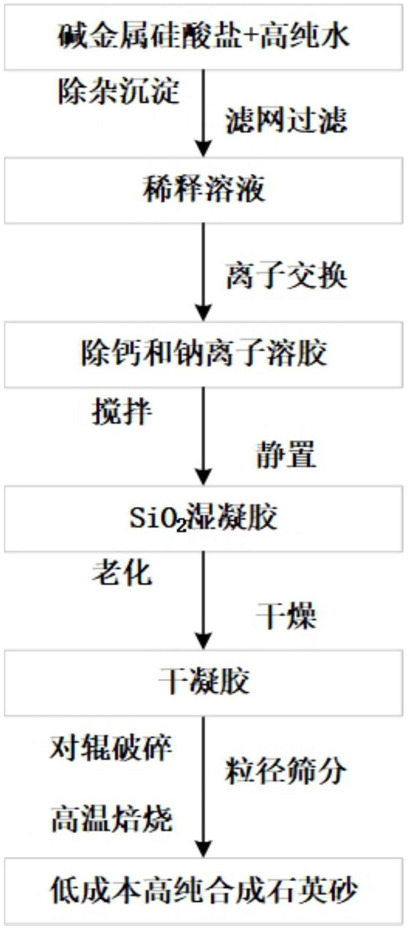 主要包括以下步驟:首先,將堿金屬硅酸鹽用高純水稀釋,隨后加入除雜劑除去雜質(zhì)元素并通過離子交換去除鈉離子;其次,將溶膠靜置并老化獲得濕凝膠;最后通過常溫常壓干燥、破碎以及高溫焙燒獲得高純合成石英砂。
