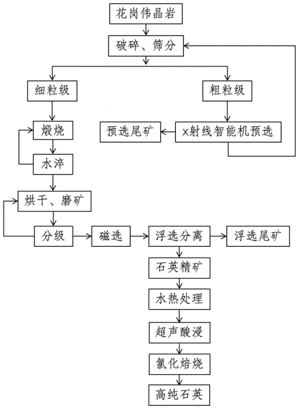 合肥萬泉非金屬礦科技有限公司發明了一種利用長石花崗偉晶巖制備高純石英砂的方法,該方法將將長石花崗偉晶巖破碎,得到小塊含石英、長石、云母礦石;將小塊礦石煅燒后立即水淬,再破碎,得到粒徑小于3mm的礦石;將礦石進行濕法球磨,將小于70目的礦漿脫泥和磁選,得到磁選石英精砂;將磁選石英精砂與酸混合,加入捕收劑后進行浮選,得到石英精砂。經提純后的長石花崗偉晶巖型高純石英SiO2含量范圍在99.9959%~99.9981%,產品純度等級達到4N5~4N8。