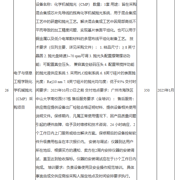 近日,中山大學(xué)發(fā)布多批政府采購意向,預(yù)算高達(dá)0.96億元,其中囊括化學(xué)機(jī)械拋光相關(guān)設(shè)備,預(yù)計采購時間為2024年12月~2025年1月。
