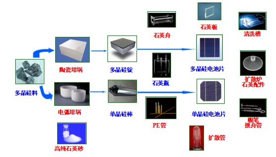 由于石英玻璃具有潔凈、同質、耐高溫等性能,目前石英坩堝廣泛用于太陽能領域提煉多晶/單晶的生產工藝中。石英坩堝是太陽能單晶生產過程中的消耗品。另外,在太陽能電池片的生產過程中,各類石英玻璃材料及制品也是其主要的工藝耗材,如擴散爐管、法蘭等。