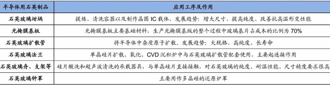 半導體制程要求高純、無污染、耐高溫的石英玻璃制品,如石英法蘭、石英舟架、石英擴散管、石英鐘罩等;合成石英玻璃具有優良的光學性能,還可以根據規格大小制成不同大小的平板,經金屬涂敷、腐蝕刻錄后制成光掩膜基板,用于印刷液晶面板中的電子線路板。