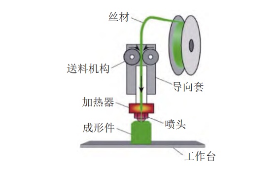 熔融沉積成型燒結(jié)技術(shù)是將絲狀熱塑性材料經(jīng)噴頭加熱熔化后,在計(jì)算機(jī)控制下使噴嘴移動(dòng)位置至前一層已固化的表面并擠出熔絲,最后逐層堆積形成三維實(shí)體。打印機(jī)包括噴頭、送料機(jī)構(gòu)、絲材、導(dǎo)向臺(tái)、加熱工作室、工作臺(tái)6個(gè)部分,具體成型過(guò)程包括送料、熔融擠出和沉積三個(gè)階段。第一階段,絲材在一對(duì)驅(qū)動(dòng)齒