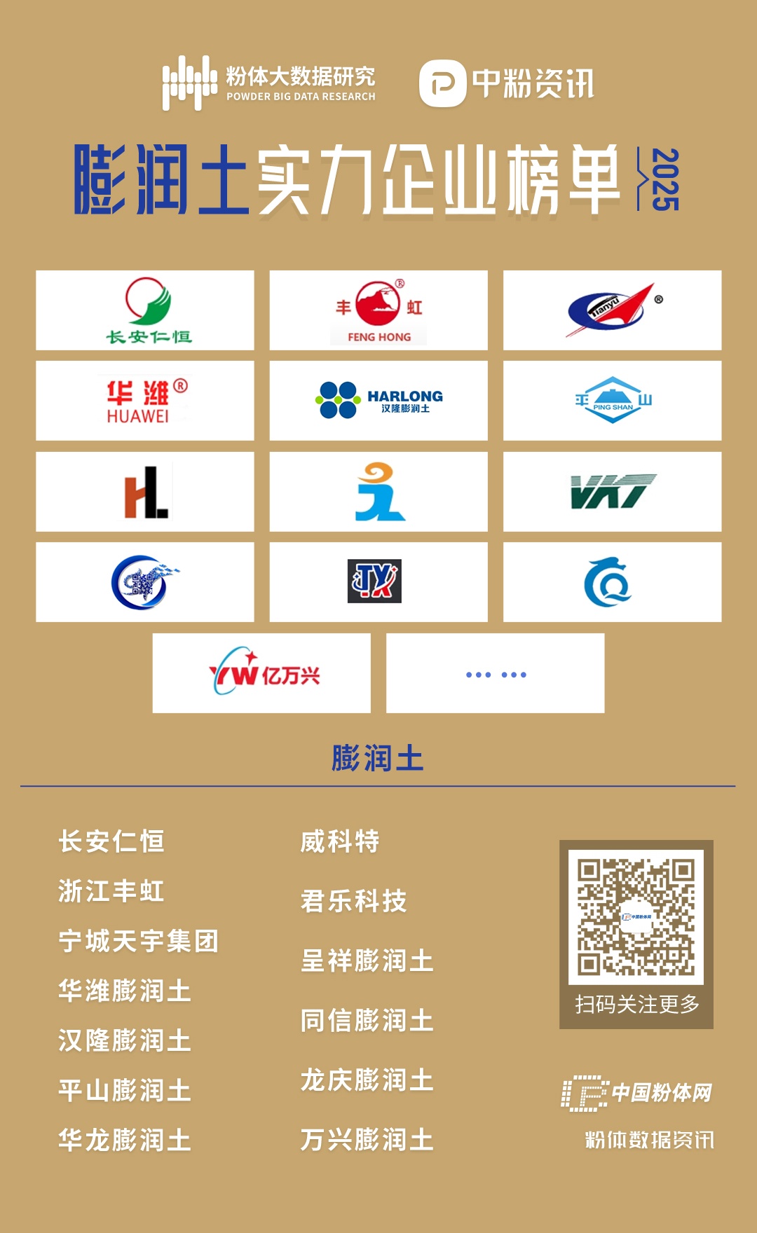 長安仁恒、浙江豐虹、寧城天宇集團、華濰膨潤土、漢隆膨潤土、平山膨潤土、華龍膨潤土、威科特、君樂科技、呈祥膨潤土、同信膨潤土、龍慶膨潤土、萬興膨潤土