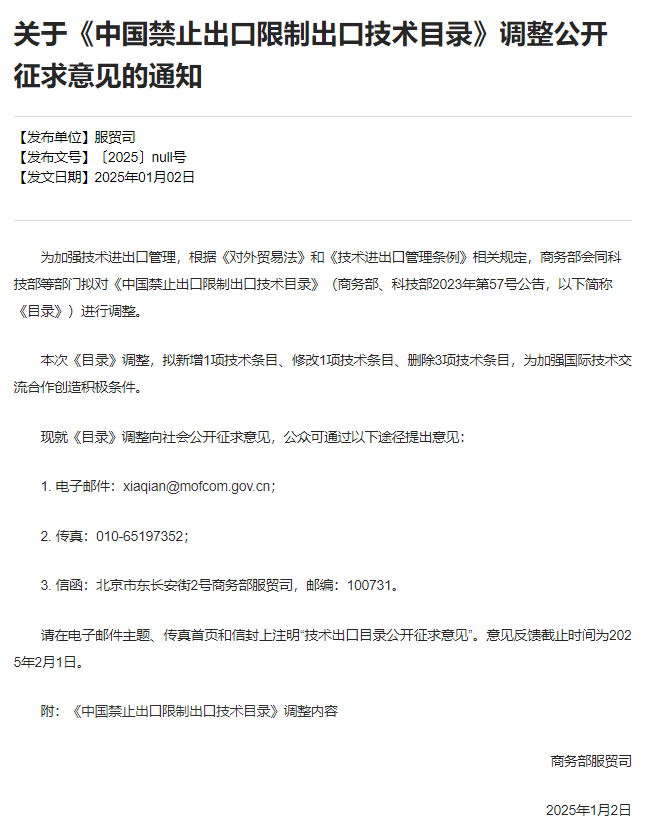中國粉體網(wǎng)訊 2025年1月2日,商務(wù)部發(fā)布關(guān)于《中國禁止出口限制出口技術(shù)目錄》調(diào)整公開征求意見的通知。
