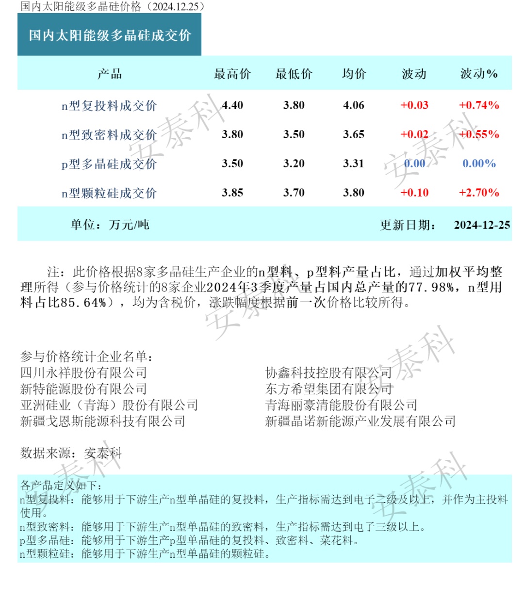 2024年12月25日,中國(guó)有色金屬工業(yè)協(xié)會(huì)硅業(yè)分會(huì)發(fā)布的太陽能級(jí)多晶硅成交價(jià)格顯示,多晶硅價(jià)格小幅上漲,N型復(fù)投料成交均價(jià)4.06萬元/噸;N型顆粒硅成交均價(jià)3.8萬元/噸;P型硅料成交均價(jià)為3.31萬元/噸。