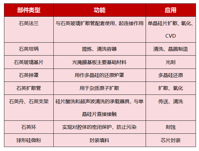 石英制品在下游應用廣泛,產品貫穿集成電路產業的各個環節,以石英砂到芯片的生產過程為例,生產過程將使用到石英坩堝、石英鐘罩、石英擴散管、石英舟、石英玻璃基片等不同類型的產品。半導體領域加工環節在芯片設計流程后,可分為三個階段:單晶硅片制造、晶圓制造和封裝測試。石英材料在半導體產業的應用主要在單晶硅片制造和晶圓制造兩個環節。石英舟、石英管、石英儀器是半導體芯片加工過程清洗、氧化、光刻、刻蝕、擴散等環節中所需要的材料。