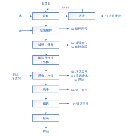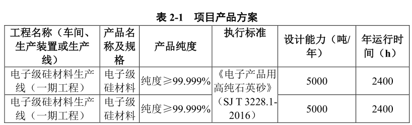 該項(xiàng)目不含酸洗及酸洗后的水洗,分兩期建設(shè),一、二期設(shè)計(jì)產(chǎn)能均為5000噸/年,產(chǎn)品為電子級(jí)硅材料(純度≥99.999%),產(chǎn)品指標(biāo)參照《電子產(chǎn)品用高純石英砂》(SJ/T3328.1-2016)。