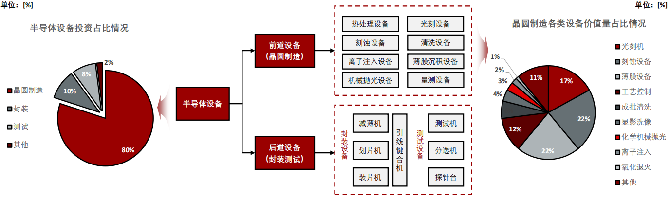 中國粉體網訊 半導體設備可分為前道設備(晶圓制造)和后道設備(封裝與測試)兩大類。前道設備投資量占總設備的80%以上,刻蝕設備、薄膜沉積設備和光刻機分別占前道設備價值量的22%、22%和17%,是半導體前道生產工藝中的三大核心設備,決定了芯片制造工藝的先進程度。