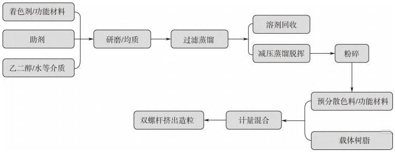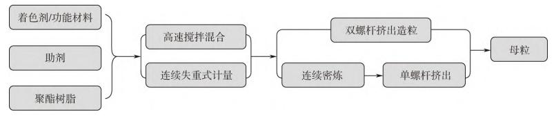 聚酯纖維用母粒(色母粒/功能母粒)的傳統制備方法操作流程簡單、成本低,且具有較大的市場競爭優勢,目前國內外大部分的聚酯纖維母粒都是采用該方法生產。