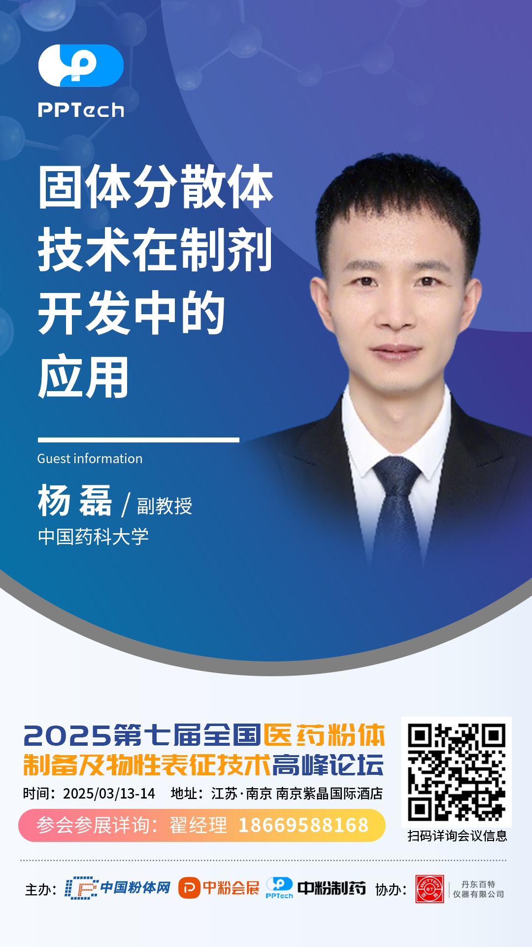 以“從粉體技術,論制藥工藝”為主題,2025年3月13-14日中國粉體網將在江蘇南京紫晶國際酒店舉辦“2025第七屆全國醫藥粉體制備及物性表征技術高峰論壇”。屆時來自中國藥科大學楊磊副教授將為大家帶來《固體分散體技術在制劑開發中的應用》的主題報告。本報告重點介紹固體分散體常用的制備方法及表征技術,關鍵輔料的應用,面臨的挑戰和發展方向。