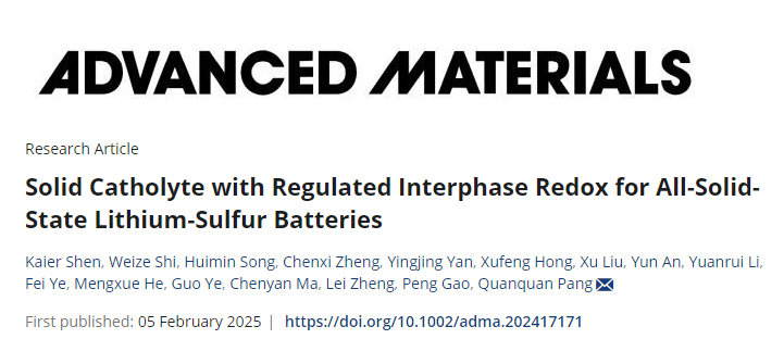 論文的第一作者為北京大學博士研究生沈凱爾,通訊作者為北京大學龐全全研究員。相關成果以“Solid Catholyte with Regulated Interphase Redox for All-Solid-State Lithium-Sulfur Batteries”為題發表在學術期刊《Advanced Materials》上。