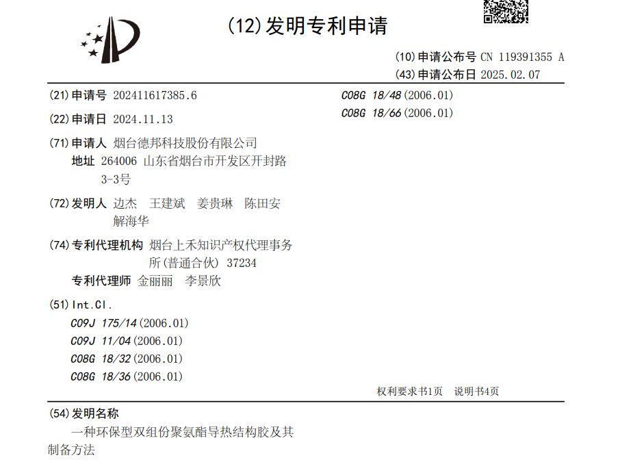 中國粉體網訊 近日,煙臺德邦科技股份有限公司成功申請了一項名為“一種環保型雙組份聚氨酯導熱結構膠及其制備方法”的發明專利,專利號為CN202411617385.6。該專利于2025年2月7日正式公開,標志著公司在環保材料領域的技術創新邁出了重要一步。