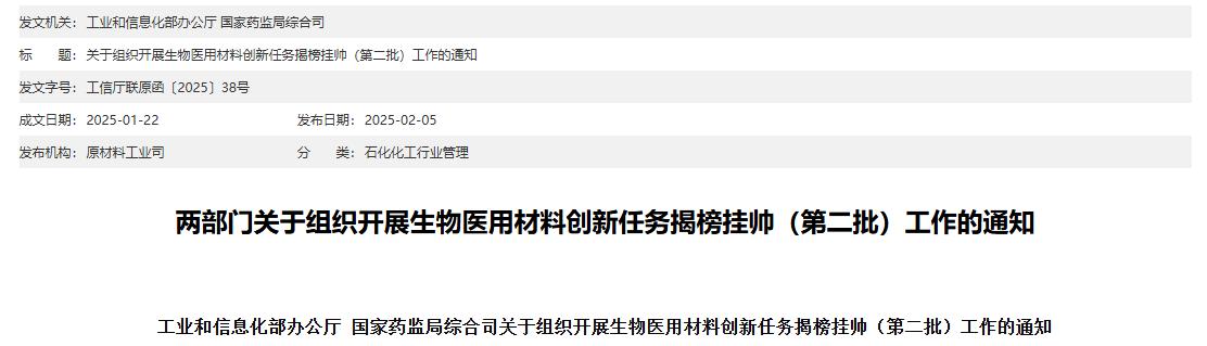 中國粉體網訊 2月5日,工業和信息化部辦公廳和國家藥監局綜合司發布“關于組織開展生物醫用材料創新任務揭榜掛帥(第二批)工作的通知”。
