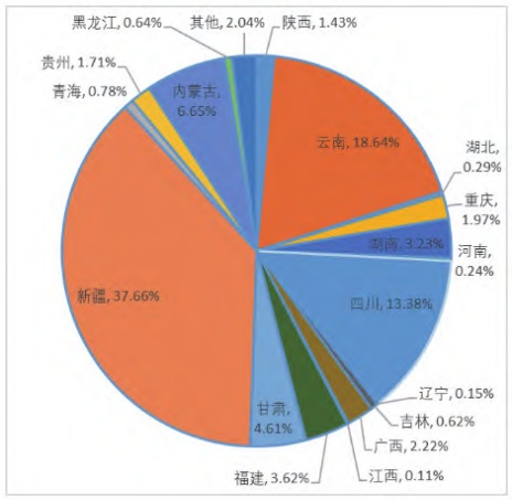 2024年新疆的產(chǎn)能占全國(guó)產(chǎn)能的37.66%,其次是云南和四川,產(chǎn)能分別占18.64%和13.38%,再者內(nèi)蒙古和甘肅也占據(jù)比較重要的比例,產(chǎn)能占比分別是6.65%和4.61%。