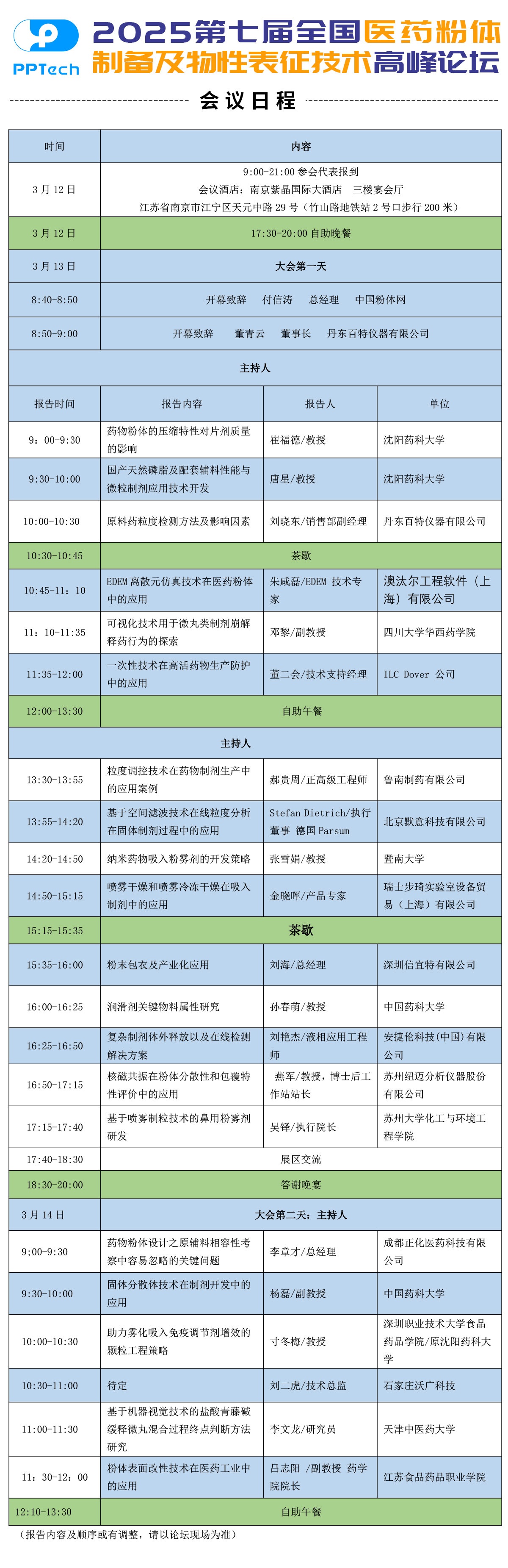 本次論壇同步設置三大模塊:國內外醫藥粉體領域專家領銜的學術峰會、跨國企業技術路演、精密設備實景操作區,形成"理論-技術-應用"立體化交流平臺,進一步推動粉體技術從實驗室研究向工業化生產的價值轉化。現誠邀各位專家、同道、醫藥粉體行業的廣大同仁,讓我們在美好的早春時節,與名師大咖,齊聚古都南京!