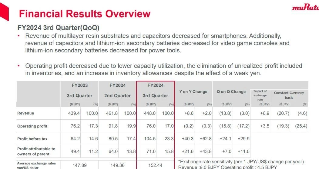 在業績上,因AI服務器相關需求加持,相關訂單增加,村田制作所訂單回升,上季純益暴增4成。據村田制作所公布的上季(2024年10-12月)財報,合并營收較去年同期成長2.0%至4,480億日元,合并營益因稼動率下滑而微減0.3%至760億日元,合并純益暴增43.8%至710億日元。