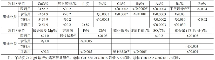 對涉及日常生活常用的食品添加劑、飼料碳酸鈣、醫(yī)藥級碳酸鈣、牙膏專用碳酸鈣對產(chǎn)品質(zhì)量要求較高,特別是對有害重金屬元素(Pb、Cr6+、As、Hg、Cd、Ba等)有嚴格要求,是名副其實的高端高值化鈣項目。