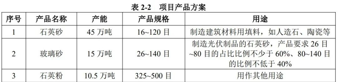 據該項目環評信息顯示,該項目生產的石英砂主要用于制造建筑材料用填料,如人造石、陶瓷等;玻璃砂用途為制造光伏制品的石英砂,產品要求26目~80目的占比比例不少于60%、80-140目的比例不低于 40%。