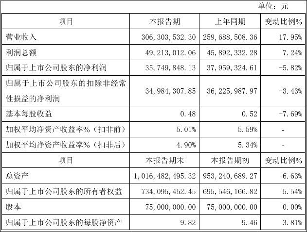 報告期內,公司預計實現營業收入30,630.35萬元,同比上升17.95%;歸屬于上市公司股東的凈利潤3,574.98萬元,同比下降5.82%;歸屬于上市公司股東扣除非經常性損益的凈利潤3,498.43萬元,同比下降3.43%;基本每股收益預計0.48元,同比減少7.69%。