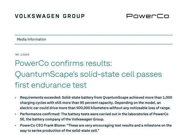 2024年1月,大眾集團子公司PowerCo的發布公告稱,PowerCo通過親手實驗證實,QuantumScape的無負極固態電池樣本,能夠做到充放電1000次,且在測試完成時電池“幾乎沒有老化”,仍保持95%的容量(放電能量保持率)。