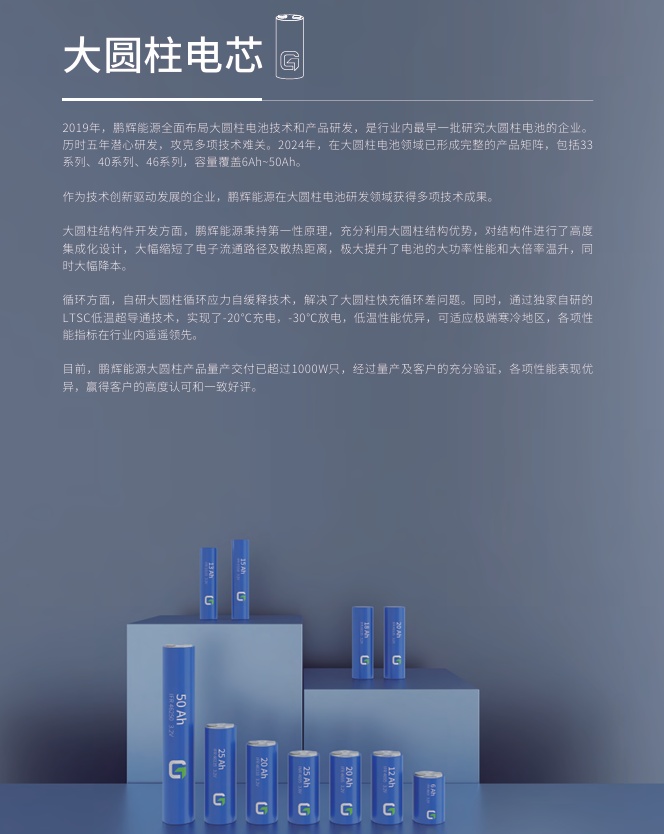 公司產品業務主要覆蓋大型儲能、工商業儲能、戶用儲能、通訊基站儲能、光儲充智慧充電、新能源汽車動力電池以及消費電池等。鵬輝能源為多家全球知名品牌提供電芯、PACK、RACK、一體化戶外儲能柜、集裝箱儲能等多種儲能產品及系統。2011年,公司進入儲能領域,是國內最早涉足儲能的企業之一。