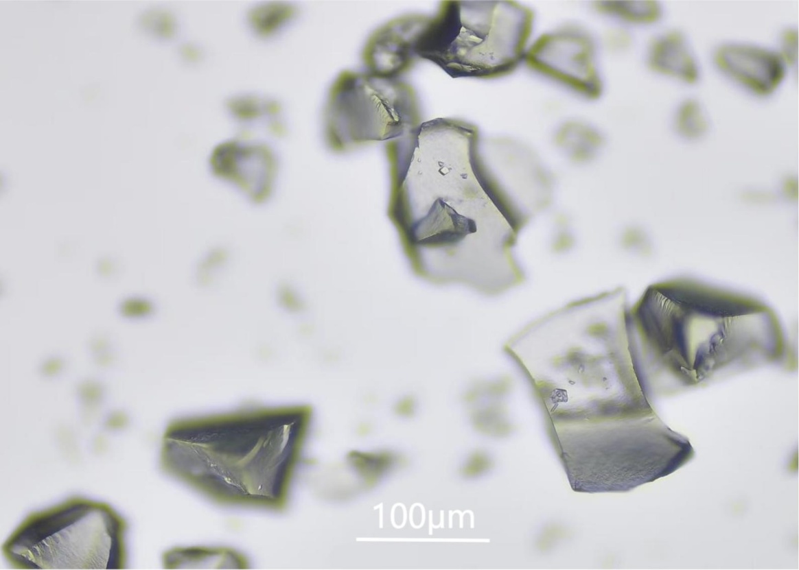 該發明提供的制備方法能夠合成純度高于99.9999%的石英砂,還能通過酸溶液的加入比例控制石英砂的粒度,該發明的制備方法顯著減少了石英砂中氣液包裹體的含量,提高石英砂的品質。該發明為光伏、半導體等領域提供一種成本低、產量高、成品率高的高純度石英砂制備方法。