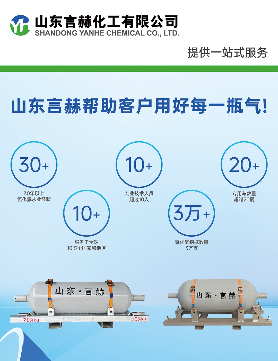 山東言赫化工有限公司是一家主要從事氯化氫氣體服務商,公司自有多位氯化氫氣體專業從業人員,幾十年如一日,一直堅持在氯化氫事業奮斗之路上。