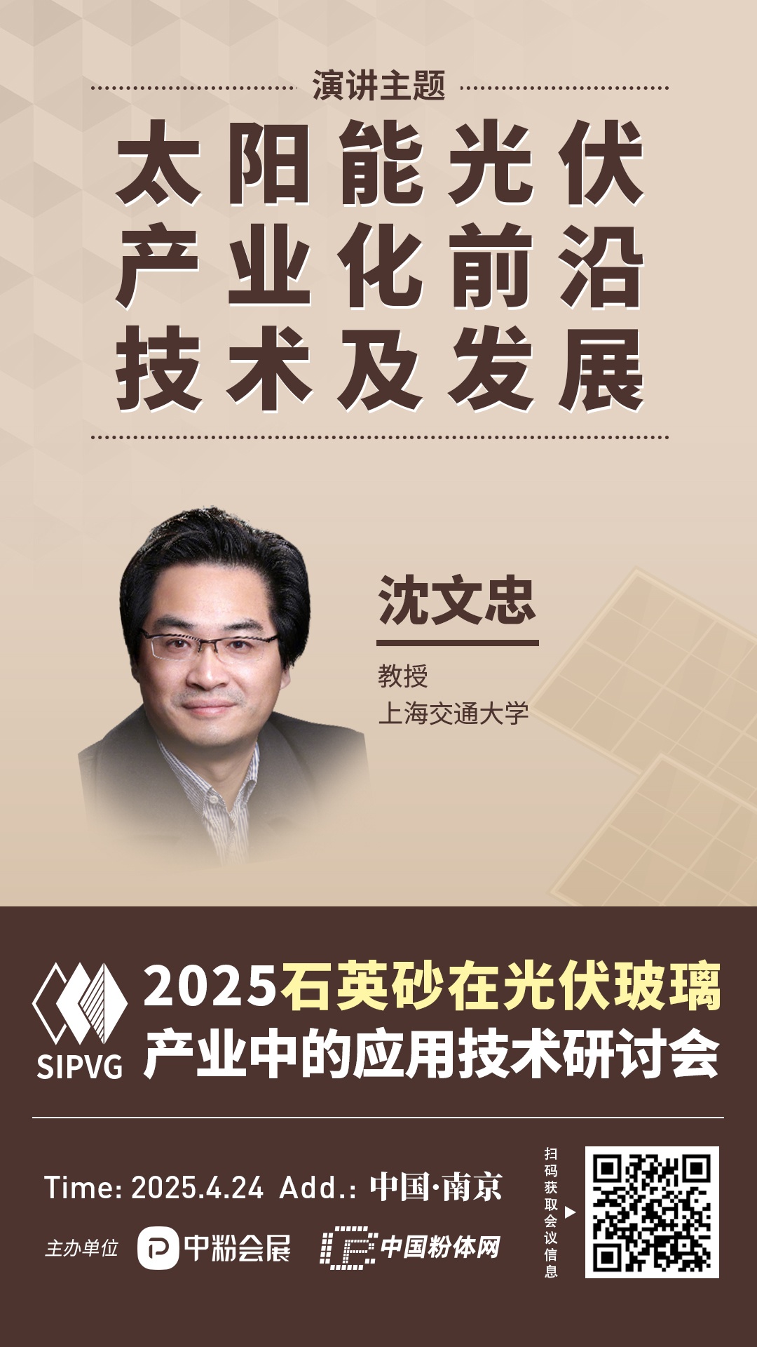 2025年4月23-24日,由中國粉體網、中粉會展主辦的“2025石英砂在光伏玻璃產業中的應用技術研討會”將在江蘇南京召開,屆時來自上海交通大學的沈文忠教授,將做題為《太陽能光伏產業化前沿技術及發展》的報告,報告將重點介紹TOPCon、SHJ、xBC等晶硅太陽電池技術這幾年的發展以及沈文忠教授對行業發展的觀點。