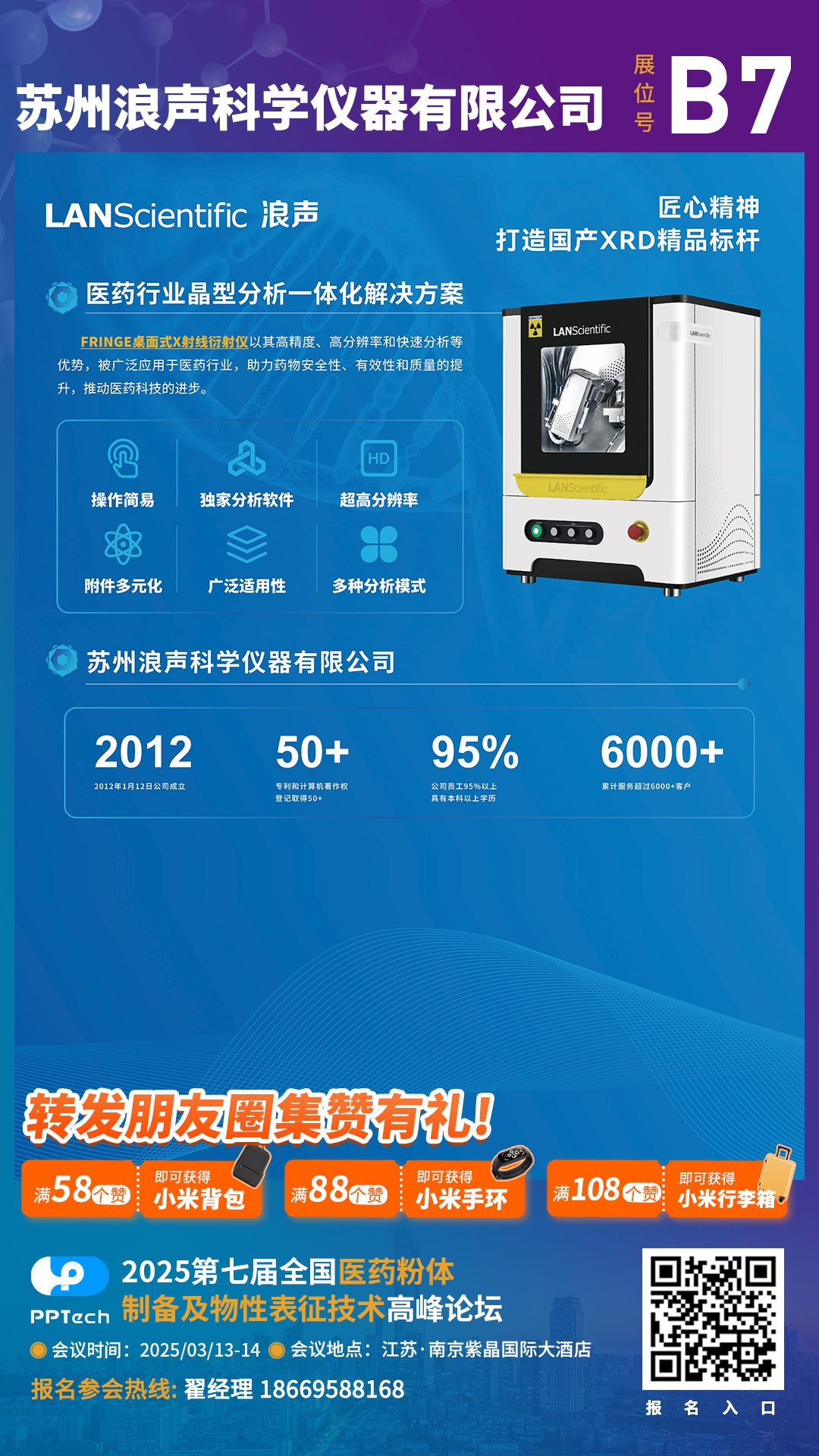 從第七屆全國醫藥粉體制備及物性表征技術高峰論壇組委會獲悉,本屆會議將于2025年3月13-14日在南京舉辦。蘇州浪聲科學儀器有限公司作為參展單位邀請您共同出席。