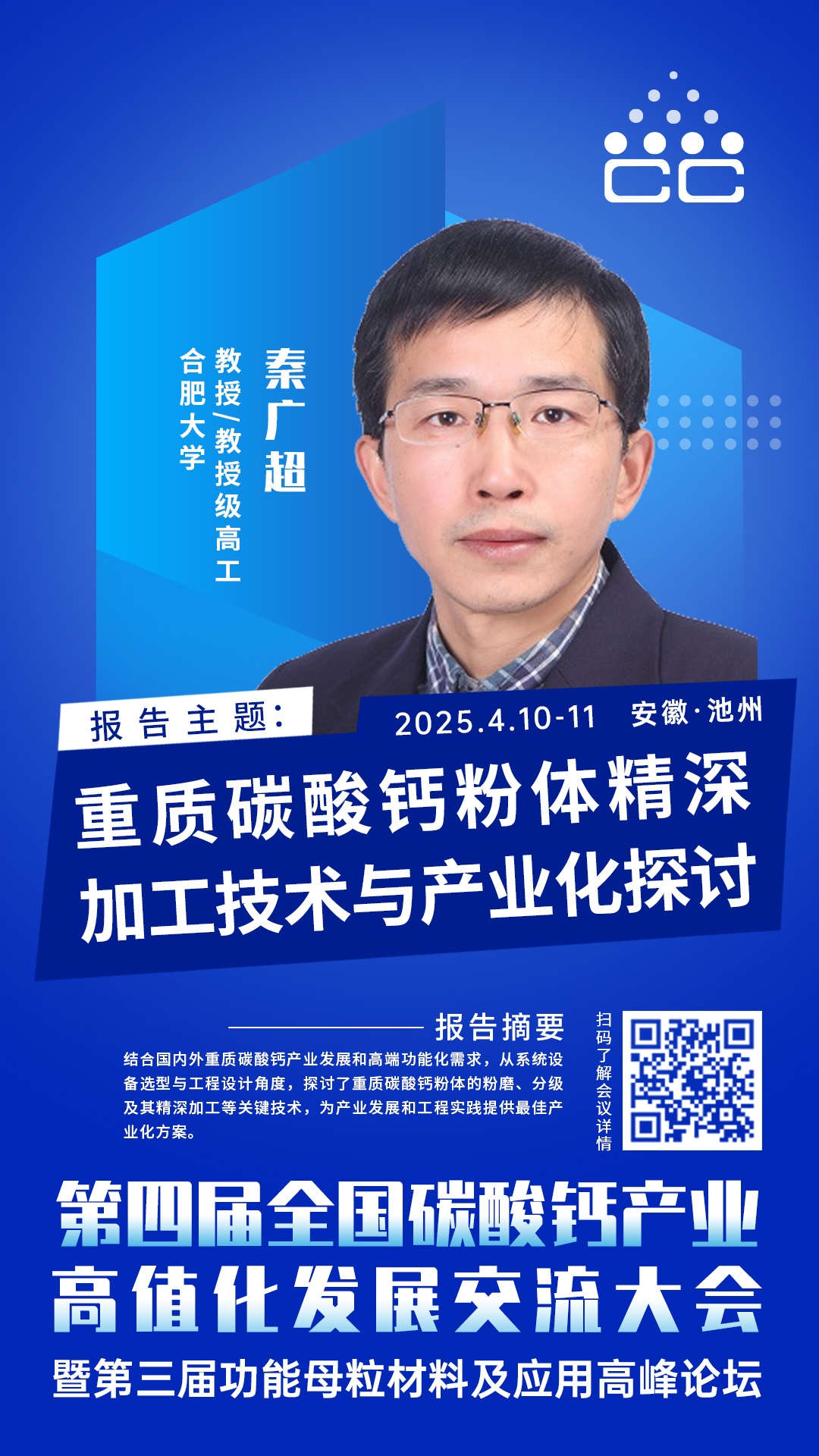 2025年4月10-11日,由中國粉體網(wǎng)主辦的第四屆全國碳酸鈣產(chǎn)業(yè)高值化發(fā)展交流大會(huì)將在安徽·池州舉行,屆時(shí)合肥大學(xué)秦廣超教授將在大會(huì)上作《重質(zhì)碳酸鈣粉體精深加工技術(shù)與產(chǎn)業(yè)化探討》主題報(bào)告,結(jié)合國內(nèi)外重質(zhì)碳酸鈣產(chǎn)業(yè)發(fā)展和高端功能化需求,從系統(tǒng)設(shè)備選型與工程設(shè)計(jì)角度,探討了重質(zhì)碳酸鈣粉體的粉磨、分級及其精深加工等關(guān)鍵技術(shù),為產(chǎn)業(yè)發(fā)展和工程實(shí)踐提供最佳產(chǎn)業(yè)化方案。
