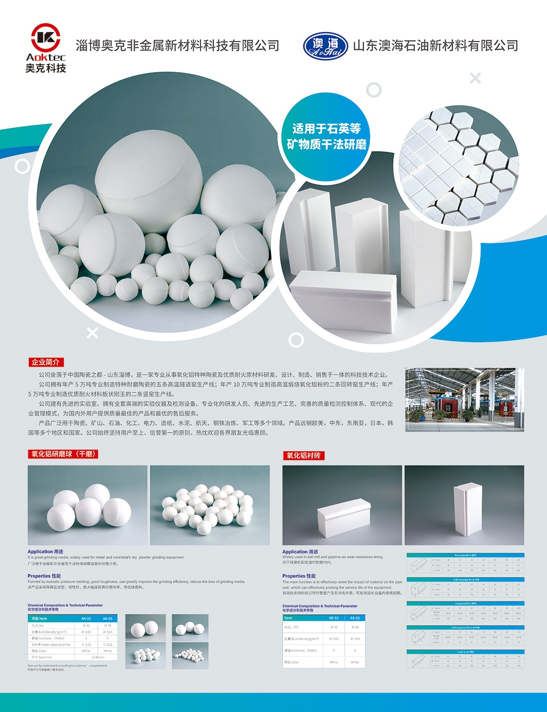 淄博奧克非金屬新材料科技有限公司坐落于中國陶瓷之都-山東淄博,是一家專業從事氧化鋁特種陶瓷研發、設計、制造、銷售于一體的科技技術企業,公司占地面積20000平方米,員工人數300人,總投資5000余萬。公司擁有兩條專業化生產線,主要生產氧化鋁陶瓷研磨介質(氧化鋁球、襯磚、氧化鋁柱球),高純惰性填料球(92%、95%、99%惰性填料球),耐磨陶瓷(耐磨陶瓷片、耐磨陶瓷管道)、氧化鋁異形件等氧化鋁陶瓷制品,公司擁有大型球磨機16臺,等靜壓機20多臺,并且建有先進的實驗室、擁有全套的實驗儀器及檢測設備、專業化的研發人員、先進的生產工藝、完善的質量檢測控制體系、現代的企業管理模式,為國內外用戶提供質量更佳的產品和售后服務。奧克科技生產的水泥干法研磨體,有球形(研磨球)和柱形(研磨段),與金屬研磨體相比產品具有耐高溫、高硬度、高強度、低磨損、耐腐蝕、低膨脹系數、高導熱性、質量輕等特性,解決了使用非金屬研磨體降低產量,磨損大和易破碎等缺點,達到節能降耗、延長設備維修周期、減少維修成本和環保生產的目的,,從而創造企業經濟利益,提高企業在行業中的競爭力。公司始終堅持用戶至上、信譽優先的原則,產品廣泛用于陶瓷,礦山,石油,化工,電力,造紙,水泥,航天等多個領域,遠銷歐美,中東,東南亞,日本,韓國等多個地區和國家,熱忱歡迎各界朋友光臨惠顧。