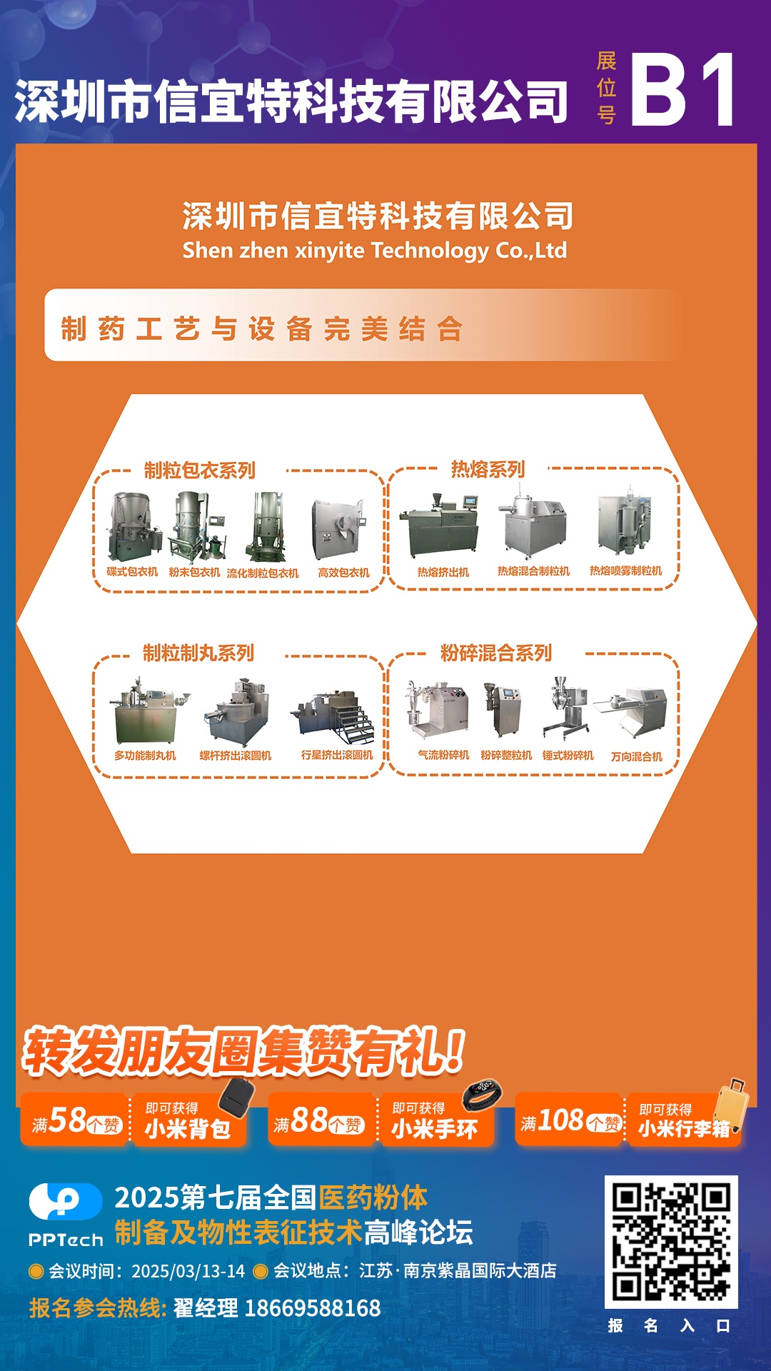 從第七屆全國醫藥粉體制備及物性表征技術高峰論壇組委會獲悉,本屆會議將于2025年3月13-14日在南京舉辦。深圳市信宜特科技有限公司作為參展單位邀請您共同出席。